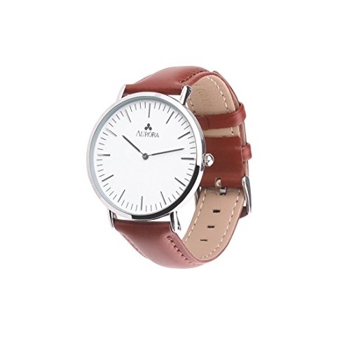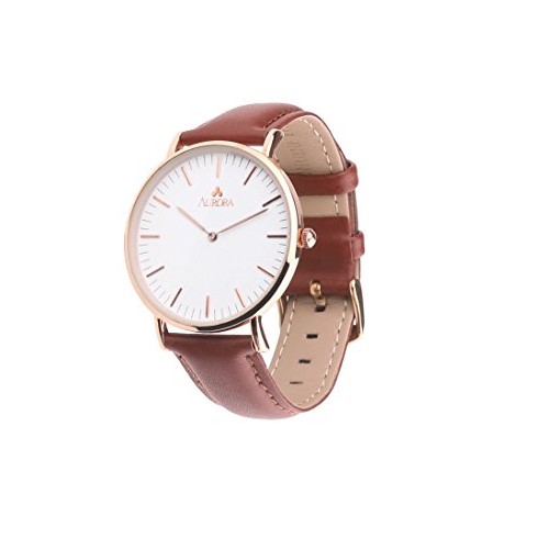 Simple, elegant and bold, the AURORA Women¡¯s Quartz Analog Watch makes it a classic and trend-setting timepiece great for everyday wear. The watch is constructed with a stainless steel case polished with top-level rose gold color and a comfortable dark brown leather bracelet with an adjustable buckle clasp. A durable mineral window protects the white dial face, which cleanly features rose gold-tone hour indexes and rose gold-tone minute markers, and complementary watch hands. It provides both decoration and practicality to women in any occasions.