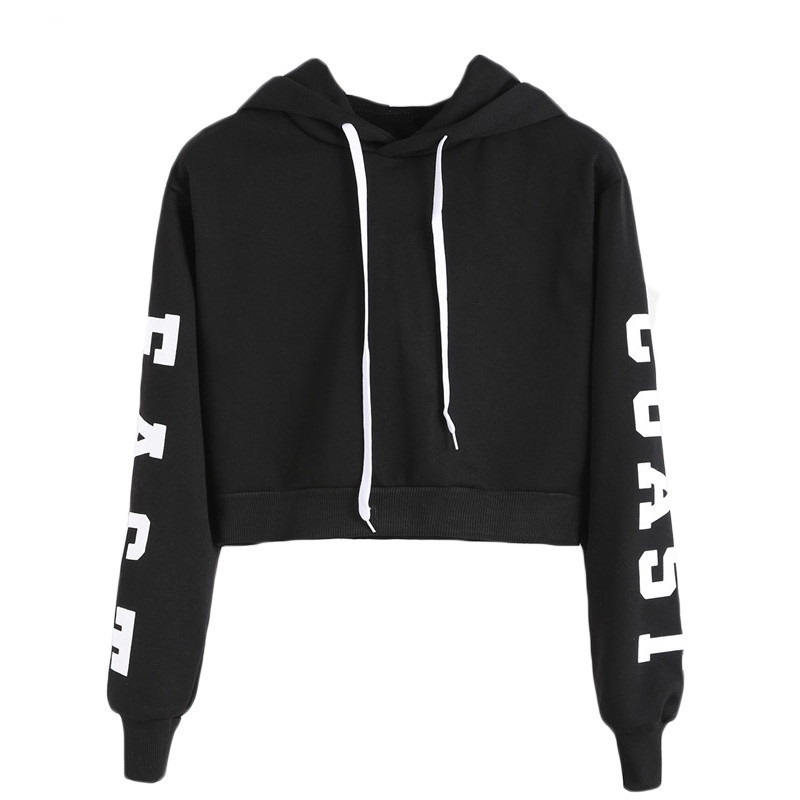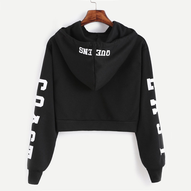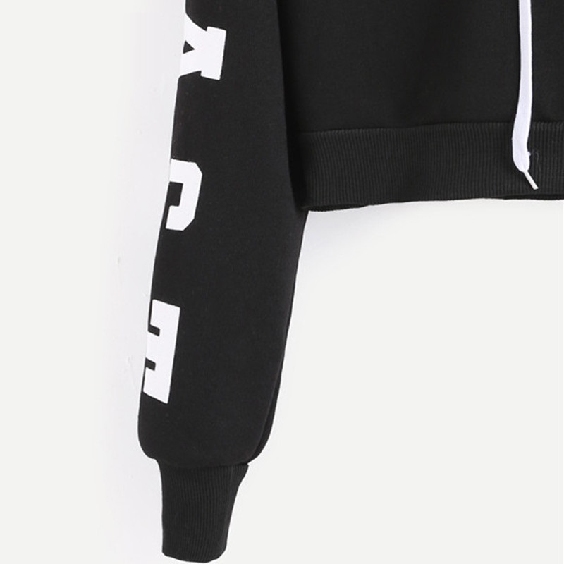 Women Street Wear Hoodie Black Letters Print Crop Long Sleeve Sweatshirt